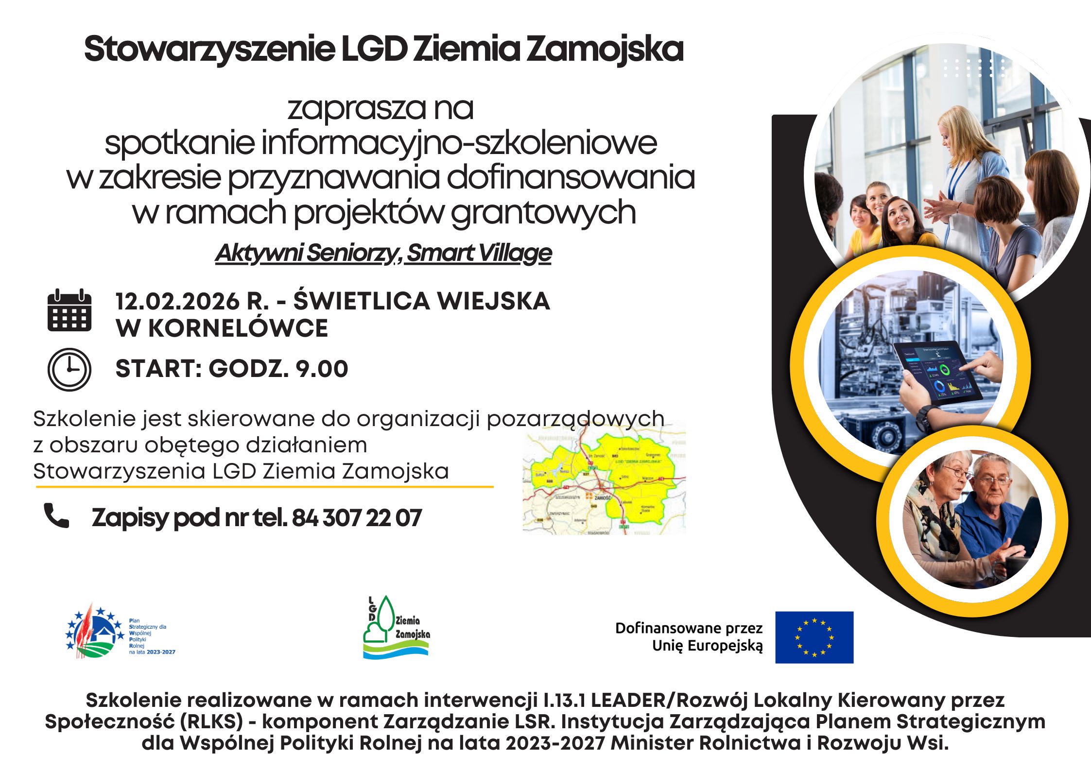 Zapraszamy na spotkanie informacyjno-szkoleniowe. Szkolenie jest skierowane przede wszystkim do organizacji pozarządowych z obszaru działania LGD Ziemia Zamojska, które są zainteresowane pozyskiwaniem grantów na działania w zakresach: Aktywni Seniorzy, Smart Village.