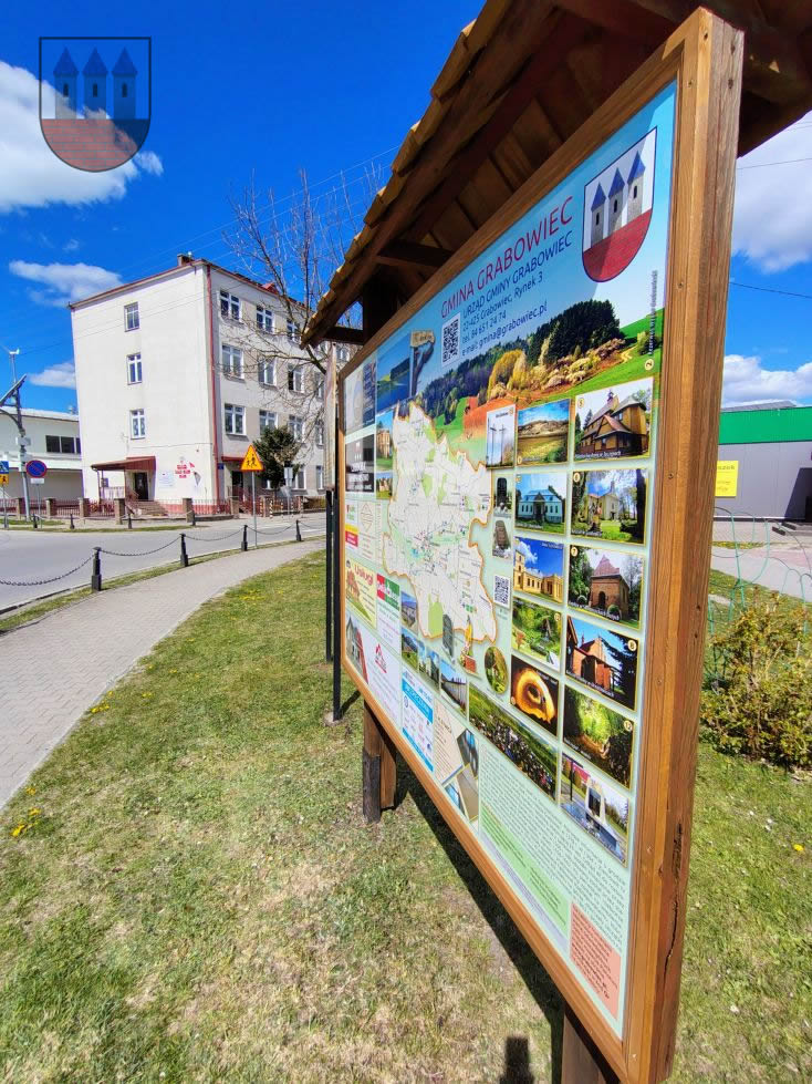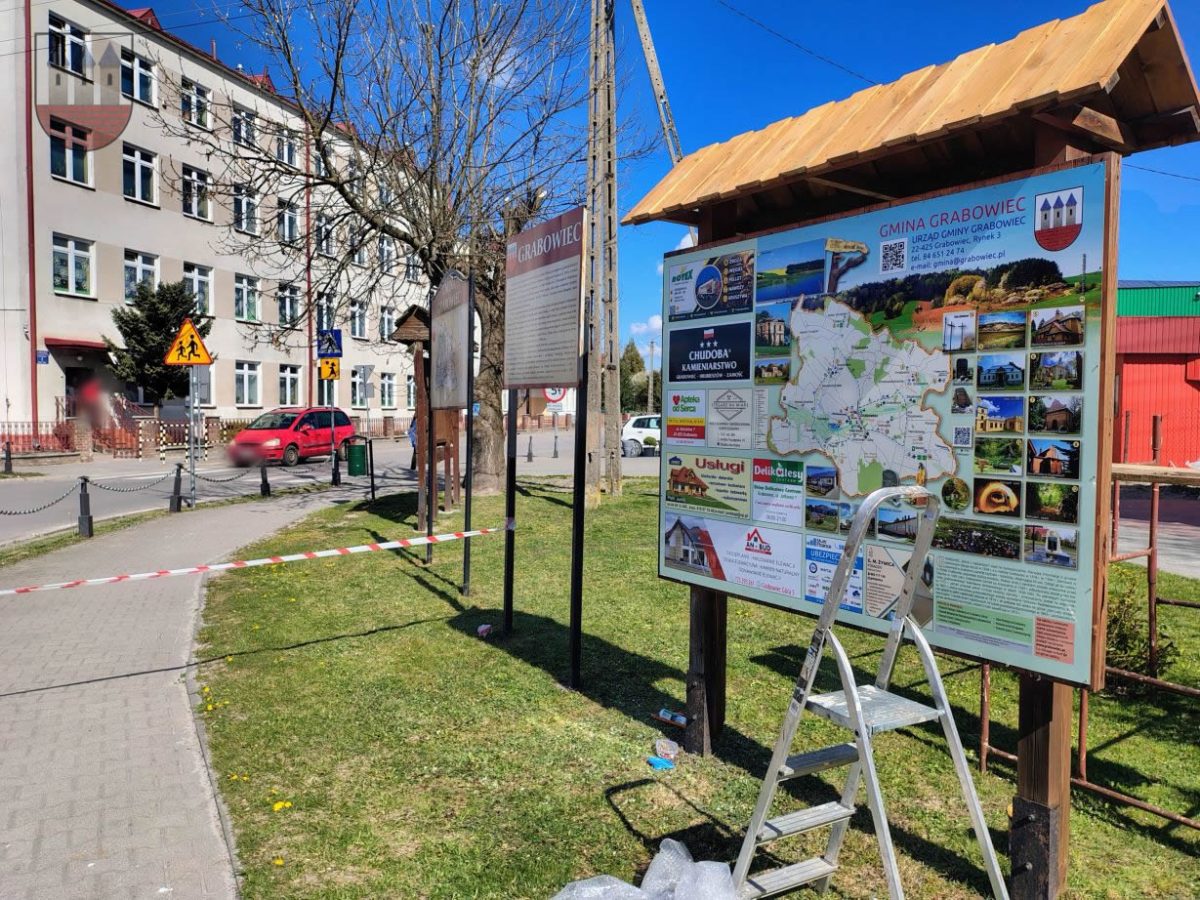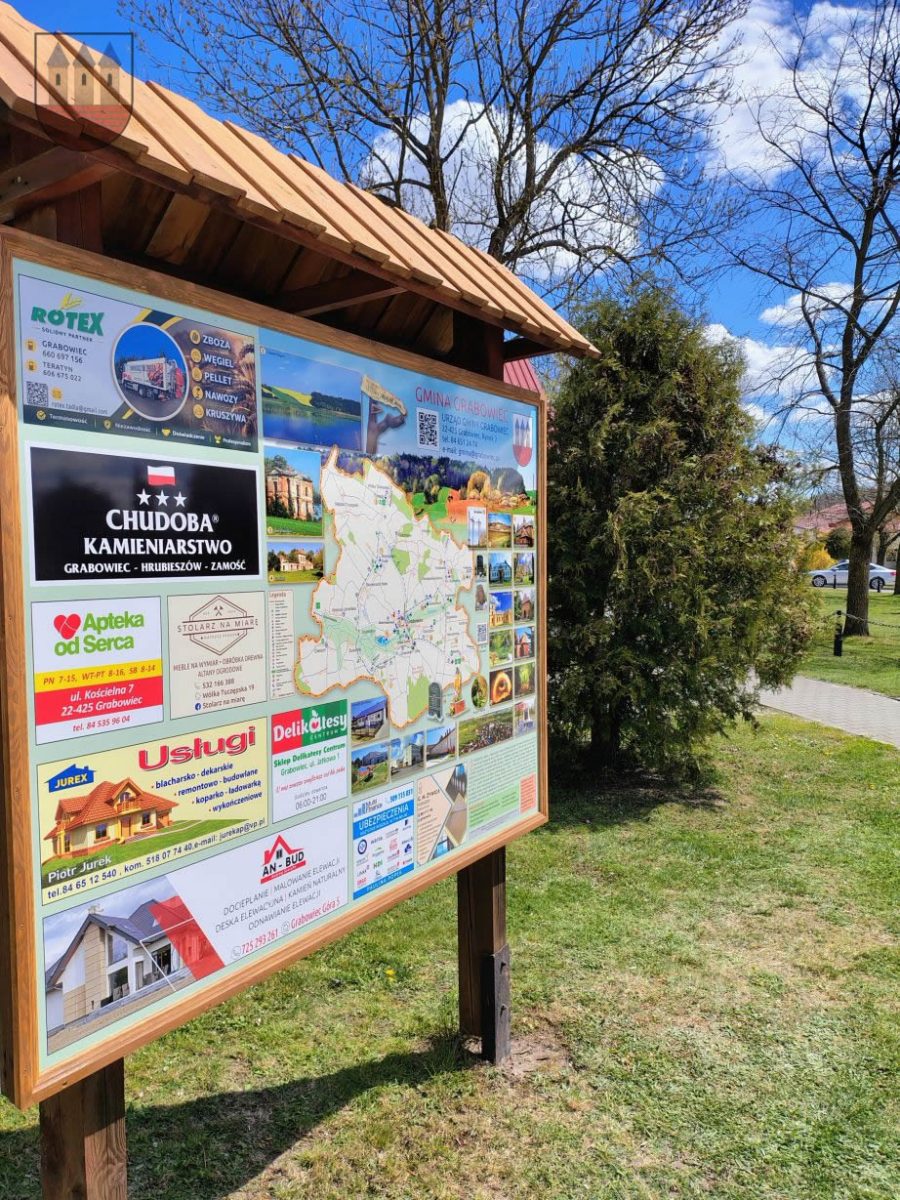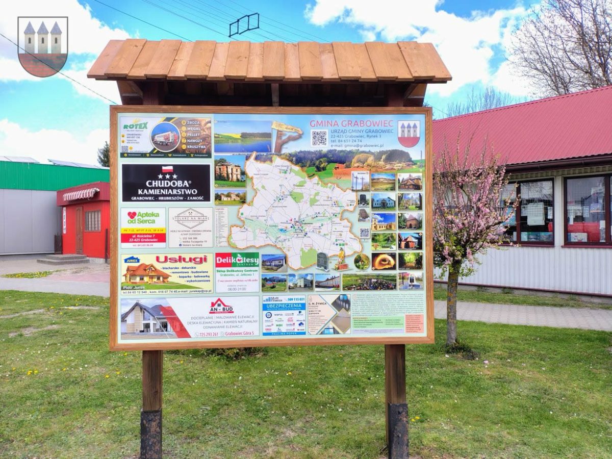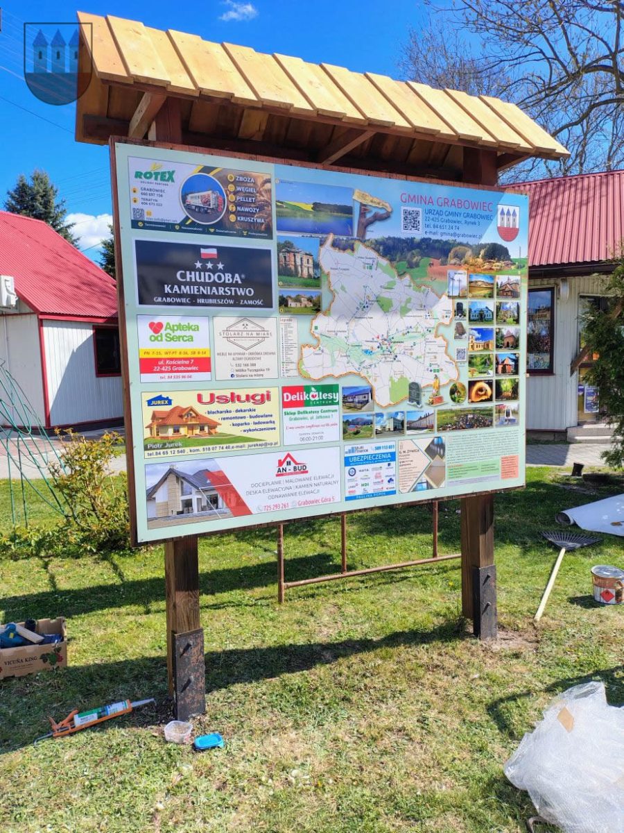 Mieszkańcy i goście odwiedzający Grabowiec mogą już korzystać z nowej mapy i kompendium wiedzy o gminie. Tablica, osadzona w solidnej, drewnianej konstrukcji z zadaszeniem, stanęła w reprezentacyjnym punkcie miejscowości, idealnie wpisując się w otaczającą zieleń.
